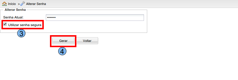 Nesta tela, marcando a opção “Utilizar senha segura” (3) e clicando na opção “Gerar” (4), o sistema irá gerar uma senha aleatória e confiável, contendo 20 caracteres, entre eles, números, letras maiúsculas e minusculas e caracteres especiais.