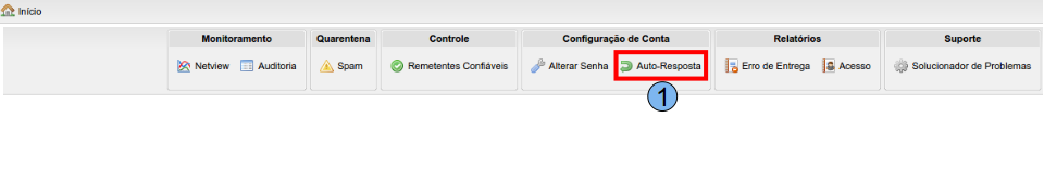 Para iniciar o processo de configuração de auto resposta do usuário, na tela inicial do Painel de Controle do usuário, como exemplo, será utilizado “teste@domínio.com.br”, clique em “Auto Resposta” (1).