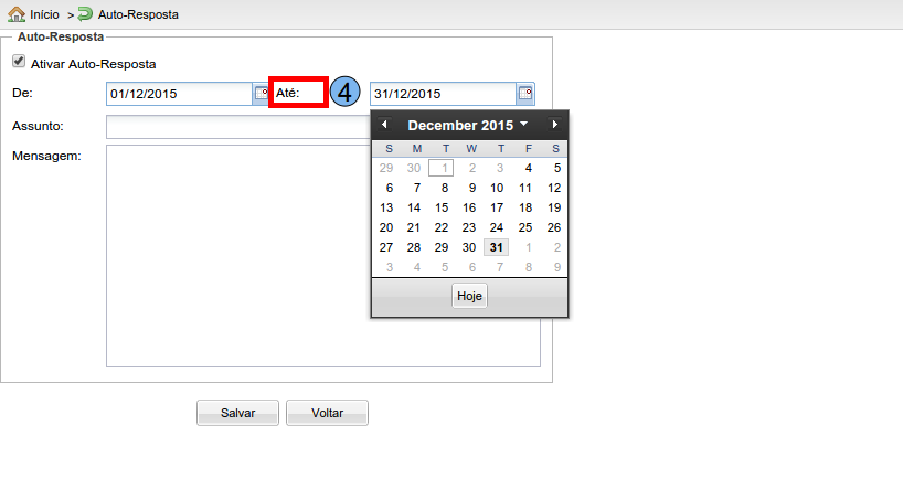 Selecione a data final para envio da auto resposta na opção “Até” (4).