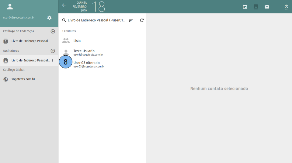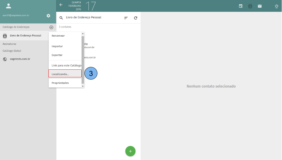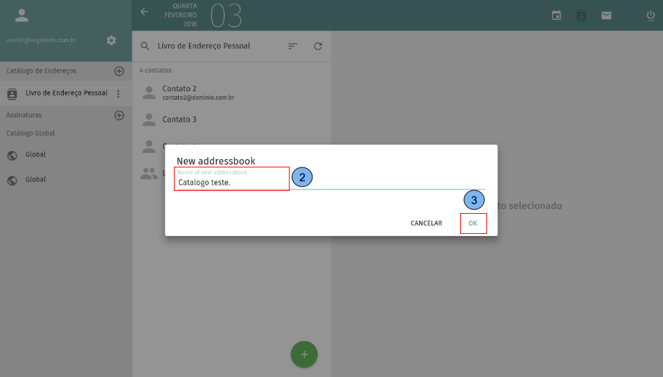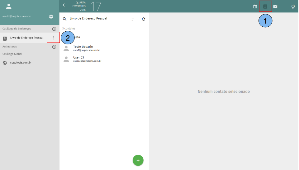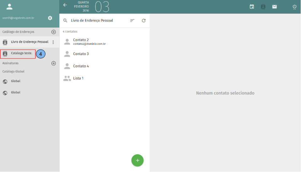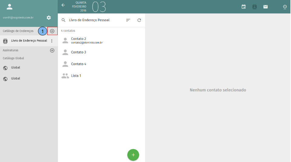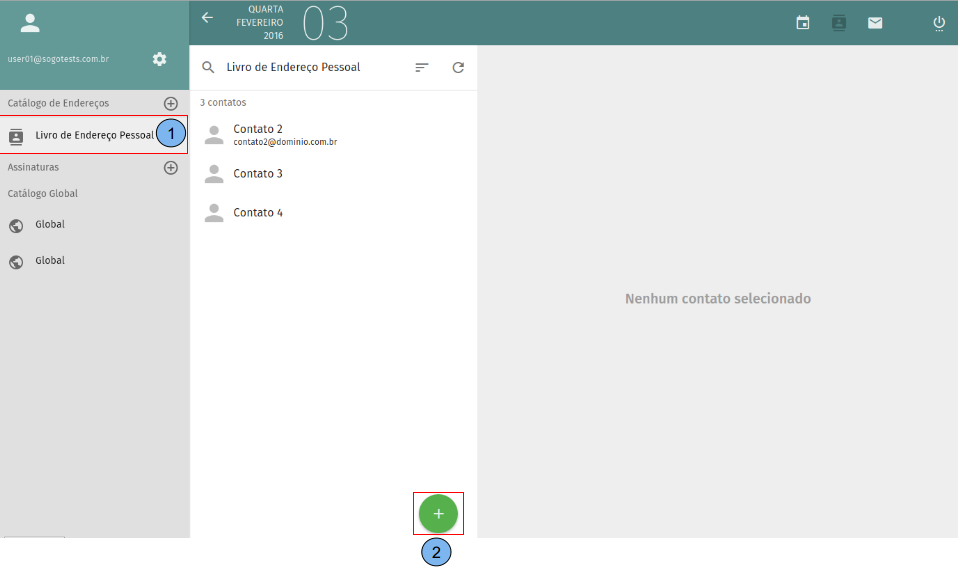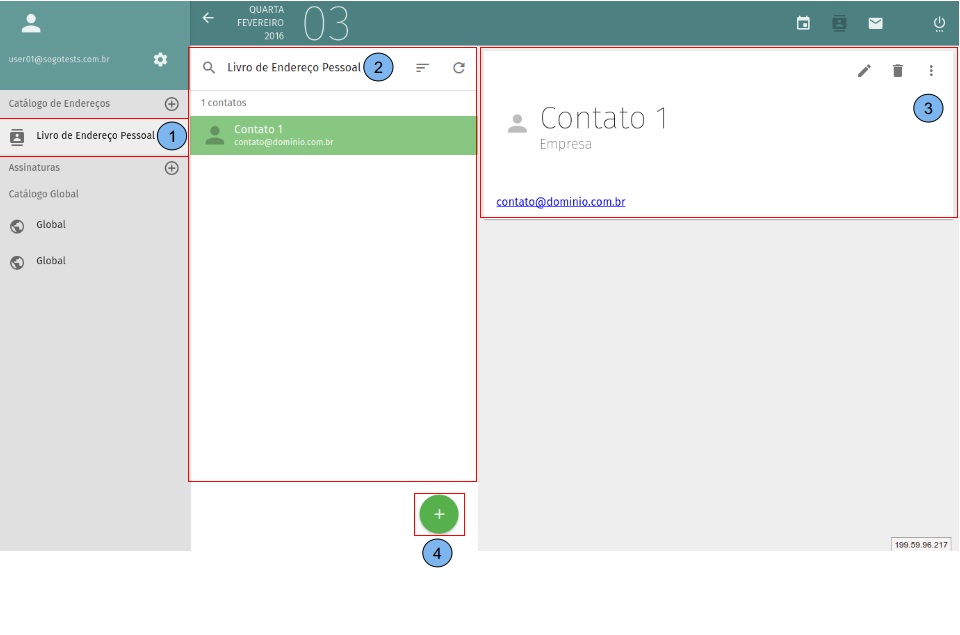 Apresentação da tela inicial do catálogo de endereços. (1)Exibe lista de catálogos, por padrão o “Livro de Endereço Pessoal” já vem criado. (2)Lista de contatos criados no catálogo selecionado no passo (1). (3)Dados do contato selecionado no passo (2). (4)Criar novo contato.