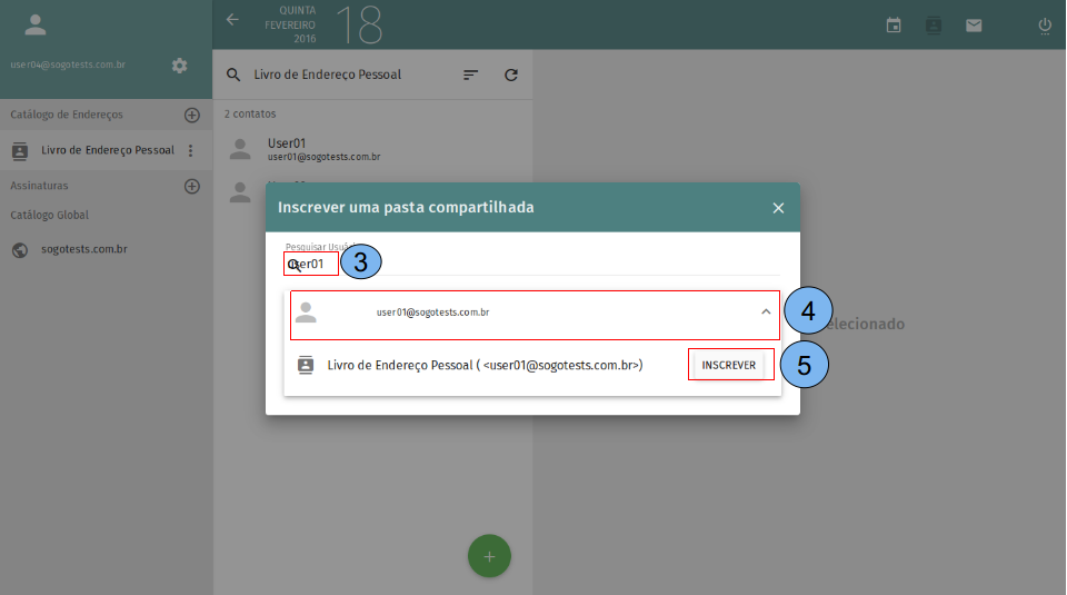 (3)Na barra de pesquisa digite o endereço de e-mail do usuário ao qual você deseja se inscrever. (4) Clique no usuário desejado. (5) Clique em “Inscrever” no catálogo ao qual você vai se inscrever.