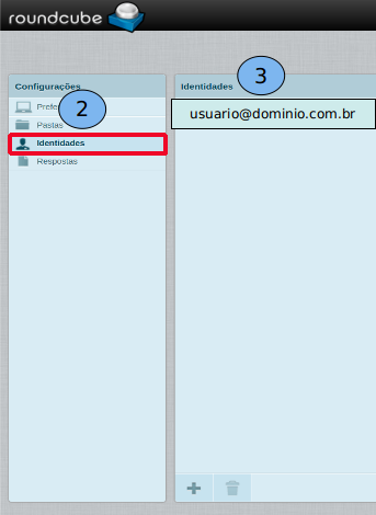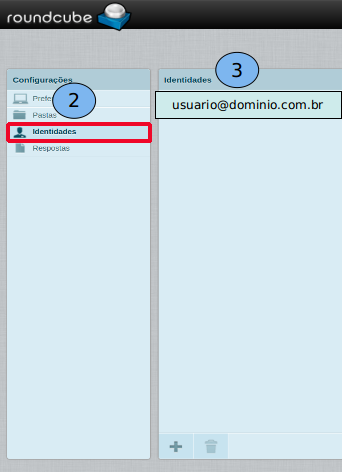 Acesse o Webmail pelo endereço: http://webmail.domínio.com.br. Realizado o acesso ao Webmail siga as seguintes orientações: Clique em “Configurações” (1), após o acesso a configuração clique em “Identidades” (2), e clique na conta do usuário (3).