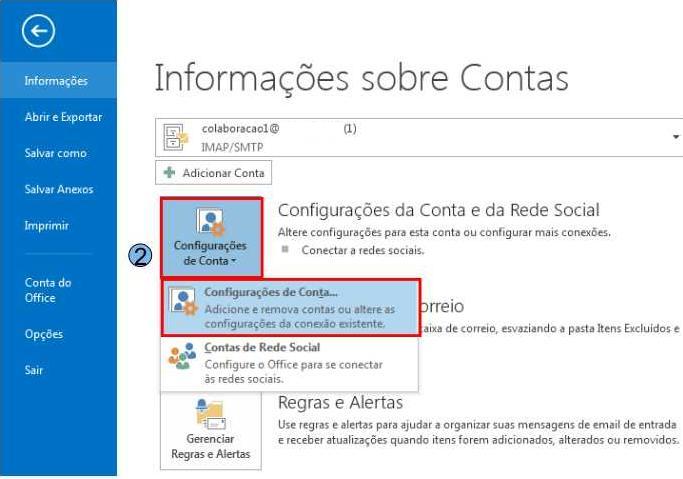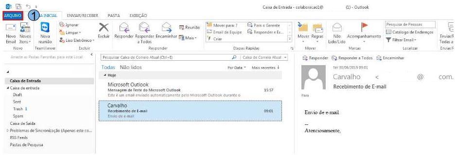 As telas abaixo mostram como realizar a configuração da conta no Outlook 2013 ou superior No canto superior utilize a opção “ARQUIVO” (1)