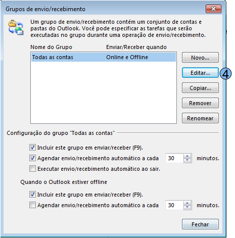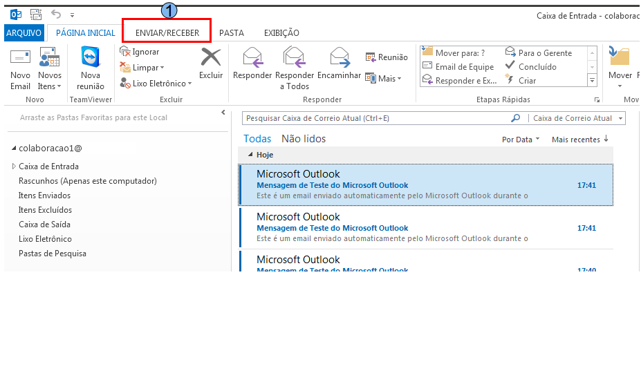 Para utilizar a novo formato de colaboração, não há Suporte para contas que estão configuradas como POP nos clientes de e-mails, sendo então necessário uma nova configuração. Recomendamos então que mesmo utilizando o procedimento abaixo, um backup da informações seja realizado com a finalidade de prevenir qualquer perda de informação. Primeiramente, realize a configuração novamente da conta seguindo as orientações do item 3.1. Em seguida vamos desabilitar o envio e recebimento de e-mails através dessa conta, lembrando que a mesma não deve ser excluída, pois os e-mails são armazenados localmente com a utilização do protocolo POP. Clique na opção “ENVIAR/RECEBER” (1) Selecione em seguida “Grupos de Envio/Recebimento” (2) e em seguida “Definir Grupos de Envio/Recebimento” (3)