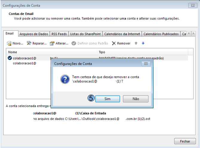 Em seguida utilize a opção “Configurações de Conta” e em seguida “Configurações de Conta” novamente (2) Na próxima tela, seleciona a conta do tipo IMAP/SMTP (3) e clique em “Remover” (4).