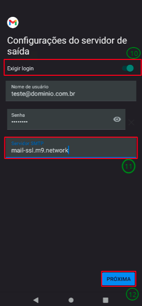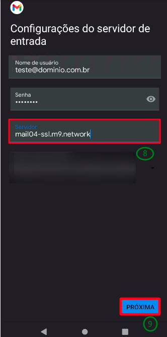Informe o Servidor de Entrada(8) onde está hospedado seu domínio, conforme análise de ping realizada anteriormente, aqui será usando bhs1-mail04 (mail04), como exemplo. Em seguida clique em Próxima(9).
