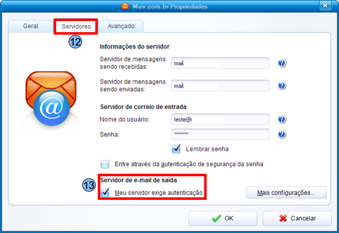 Na aba ”Servidores” (12), verifique se as configurações estão de acordo e marque a opção “Meu servidor exige autenticação” (13). Após procedimentos acima, clique na aba “Avançado”, ao lado da aba “Servidores” (12).