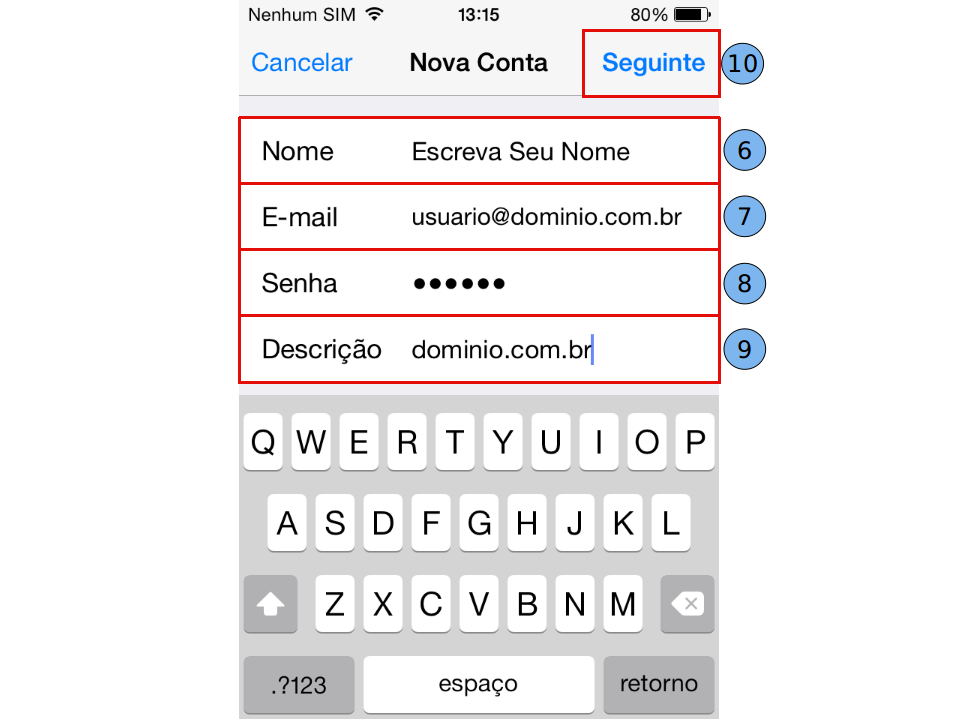Descrição (9): digite seu e-mail ou a descrição que desejar. Seguinte (10).