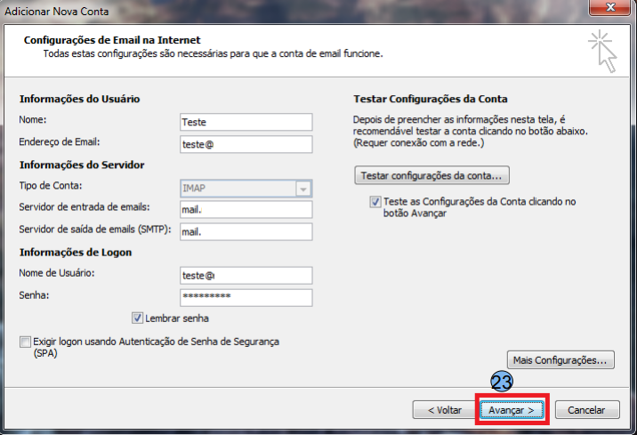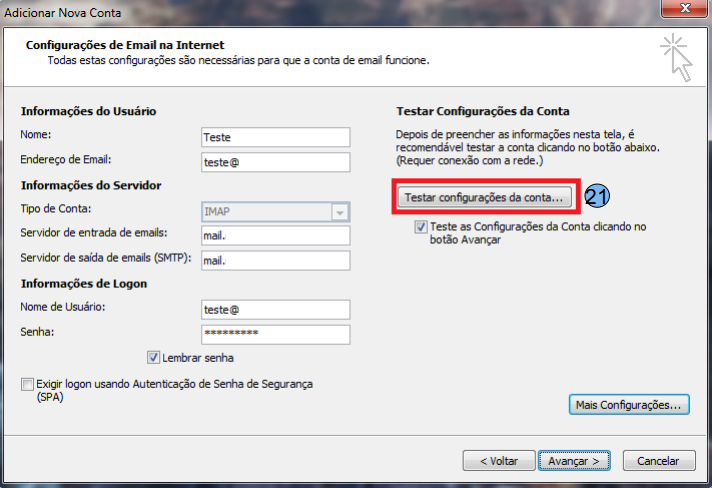Nesta tela, clique na opção Testar configurações da conta (21), será feito o procedimento de teste de envio e recebimentos de emails.
