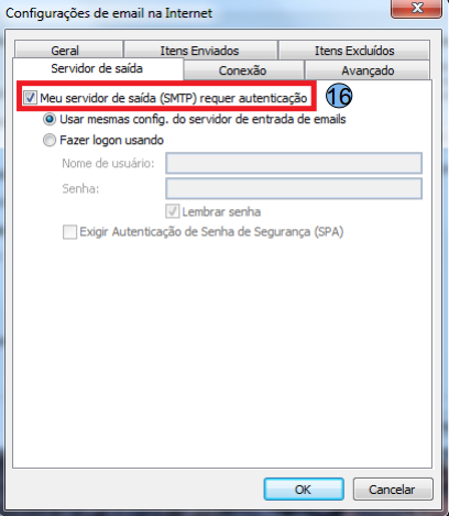 Na aba Servidor de saída, marque a opção Meu servidor de saída (SMTP) requer autenticação (16), a opção abaixo Usar mesmas configurações do servidor de entrada de emails, será marcada automaticamente, após os procedimentos, clique na aba Avançado.