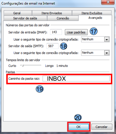 Na aba Avançado, a opção Servidor de entrada (IMAP) (17), deve inserir a porta 143 e na opção Servidor de saída (SMTP) (18), deve inserir a porta 587. Na opção Pastas (19), digite INBOX (com letras maiúsculas), assim os diretórios contidos no Webmail serão sincronizados, em seguida clique em Ok (20).