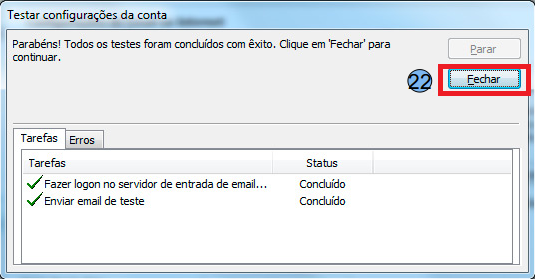 Na tela abaixo, exibe o teste validando o envio e recebimento, sendo assim, a configuração está correta, basta clicar em Fechar (22).