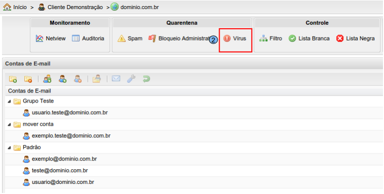 Na guia “Quarentena”, clique em opção “Vírus” (2).