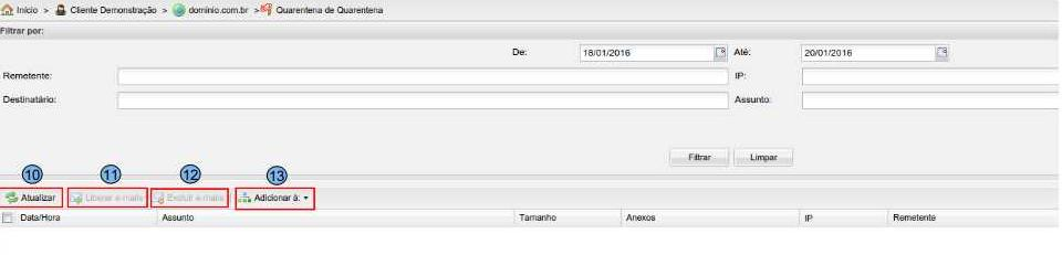 “Atualizar” (10) - para atualizar a página atual clique na opção Atualizar. “Liberar e-mails” (11) - É utilizado quando uma mensagem é barrada na “Quarentena de Vírus” e é necessário que e a mesma seja entregue na caixa postal. “Excluir E-mail” (12) - Caso queira remover a mensagem antes de 14 dias clique em Excluir E-mail. “Adicionar à:” (13) - Será exibida as opções “Lista branca”, “Lista Negra”. Selecione um e-mail que contém o corpo da mensagem na auditoria e clique em “Adicionar à:”, clicando ambas as opções é possível adicionar o “E-mail”, “Domínio” “IP” do remetente na “Lista branca” Ou “Lista Negra”.