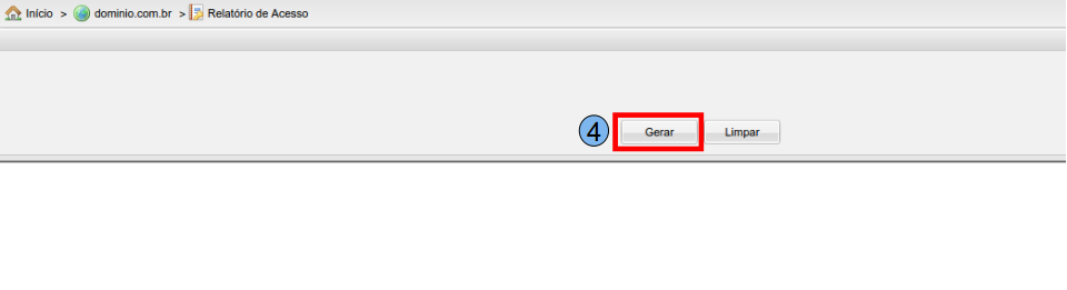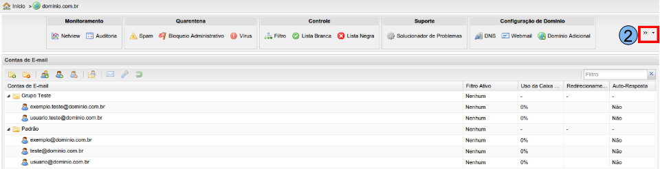 Para iniciar o processo de visualização do relatório de último acesso às caixas postais, na tela inicial do Painel de Controle, localize o domínio desejado, neste caso, será utilizado “domínio.com.br” (1), clique duas vezes sobre o mesmo.