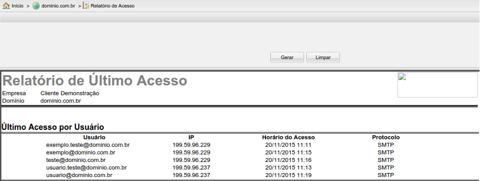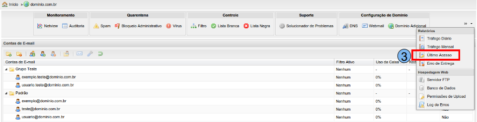 Nesta tela será exibido o relatório de último acesso de todas as contas de e-mail do domínio, será possível visualizar as contas de e-mails, os IPs que realizaram o acesso, o último horário acessado e também por qual protocolo, sendo eles SMTP, POP3 e IMAP.
